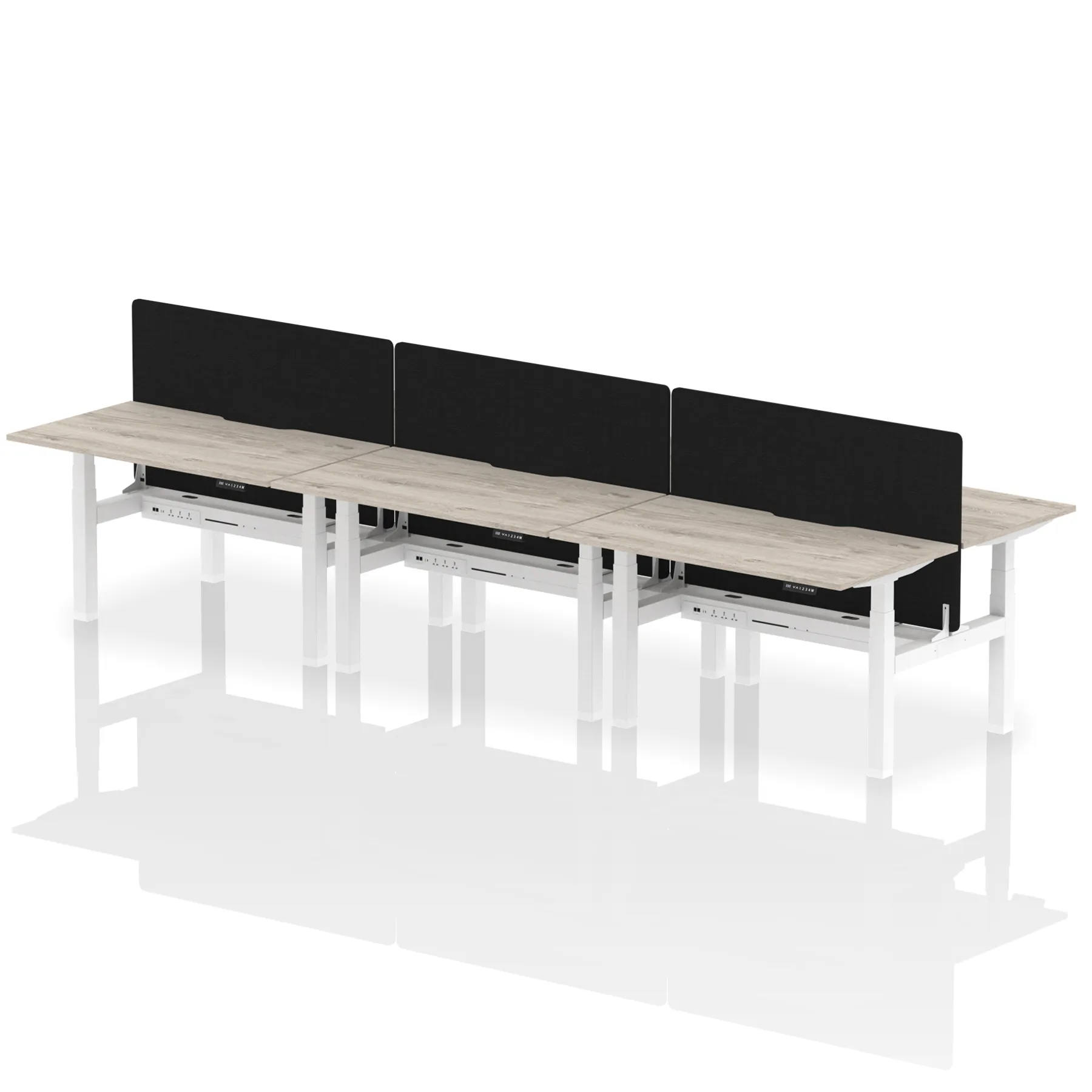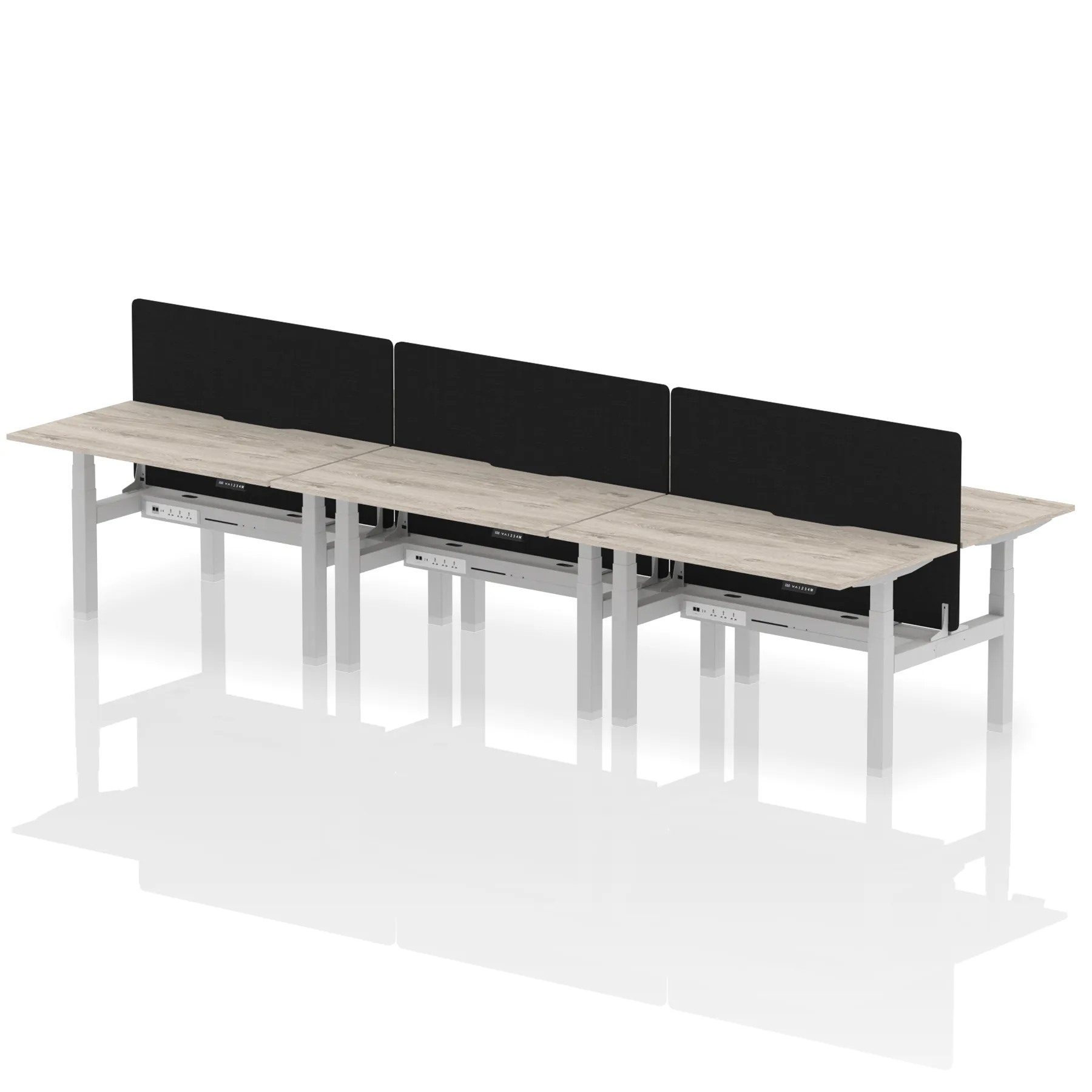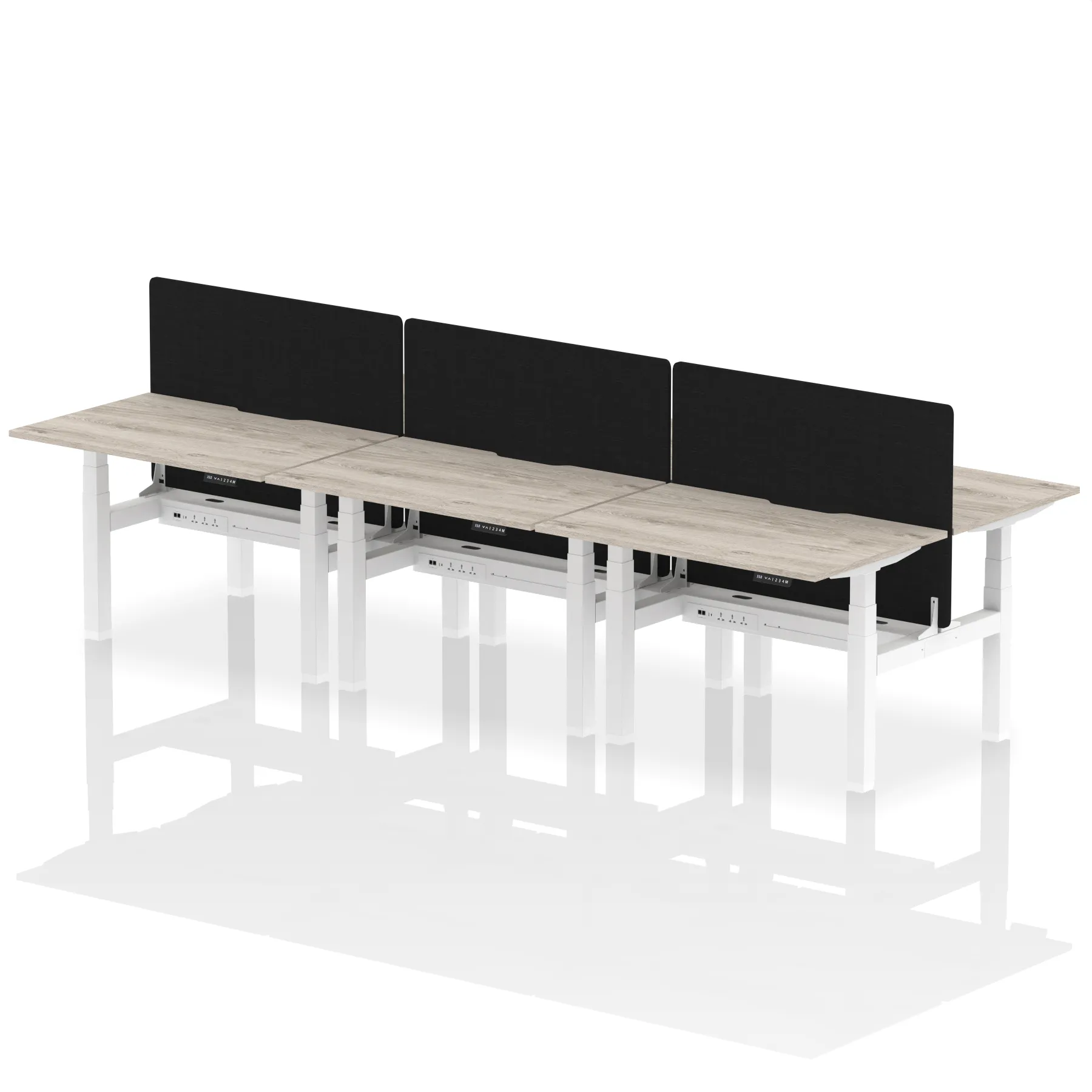 Experience cutting-edge collaboration with the Air Back-to-Back Height Adjustable Desk for six, featuring a unique scalloped edge design and a dividing screen per duo. Each desk is outfitted with two Ethernet ports, a USB port, a USB-C port, and three UK plugs, ensuring unparalleled connectivity. The adjustable height caters to ergonomic needs, making it perfect for dynamic teams who prioritize both style and functionality in their workspace.