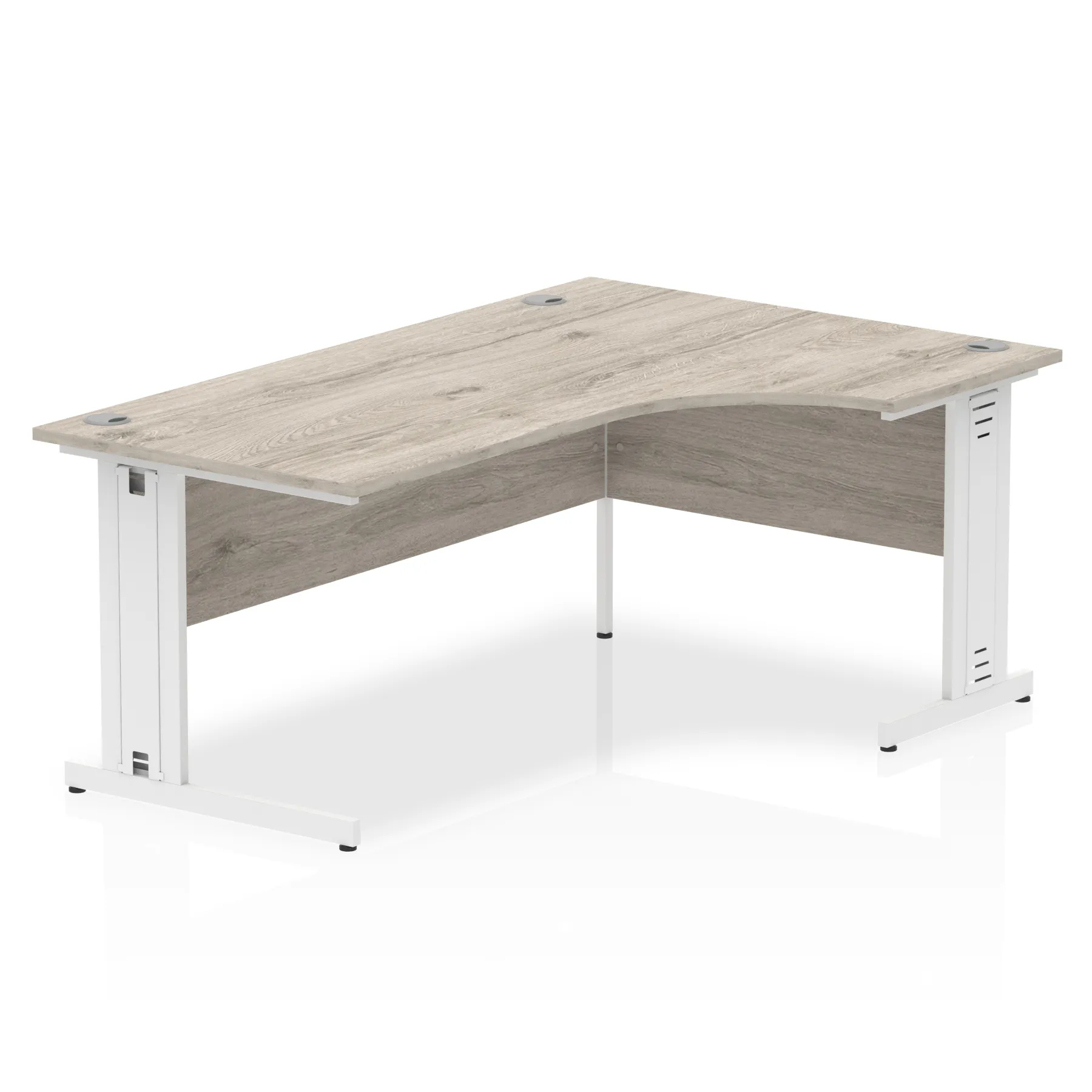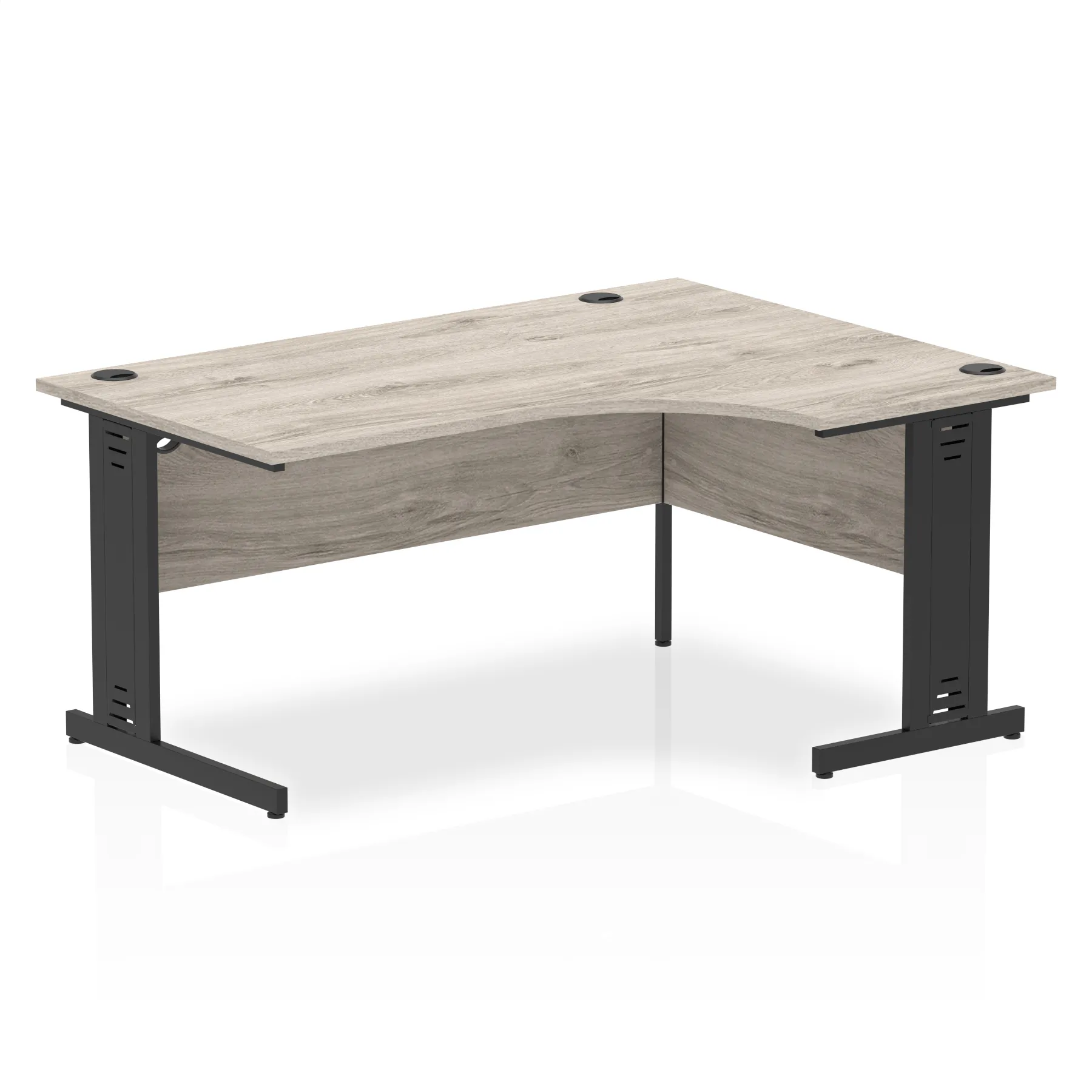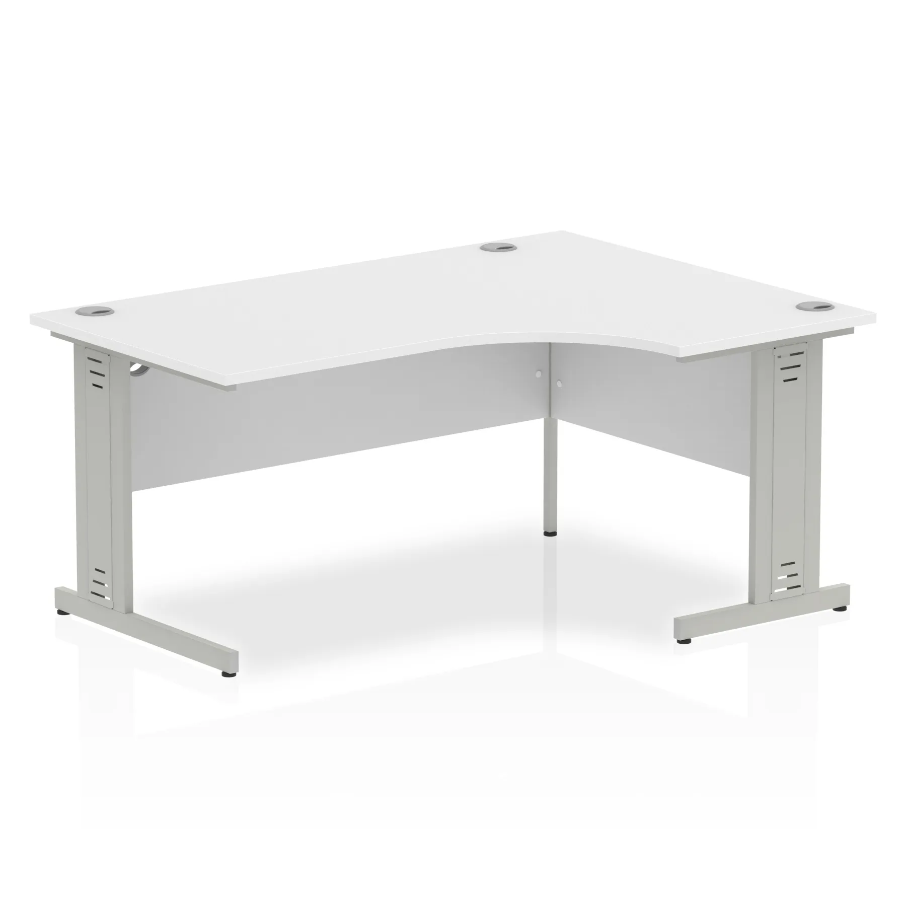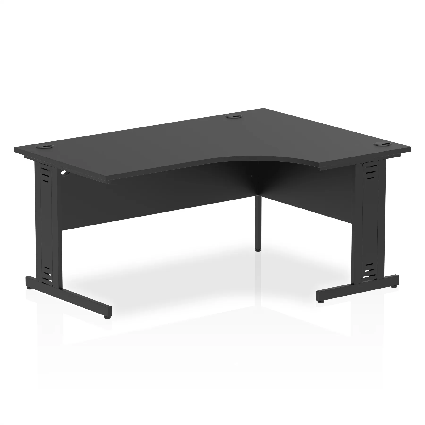 • Impulse contract 1600 wide crescent desk • 25mm tops • Heat resistant melamine finish • 18mm modesty panels • 2mm protective abs edging • Double strut legs • 3 cable ports • Height adjustable feet • Steel to steel fixings • 3 modesty panels slots • 600 deep • Deep set modesty panel (5″) allows for compatibility of most screen clamp fittings • Weight Capacity: 135Kg