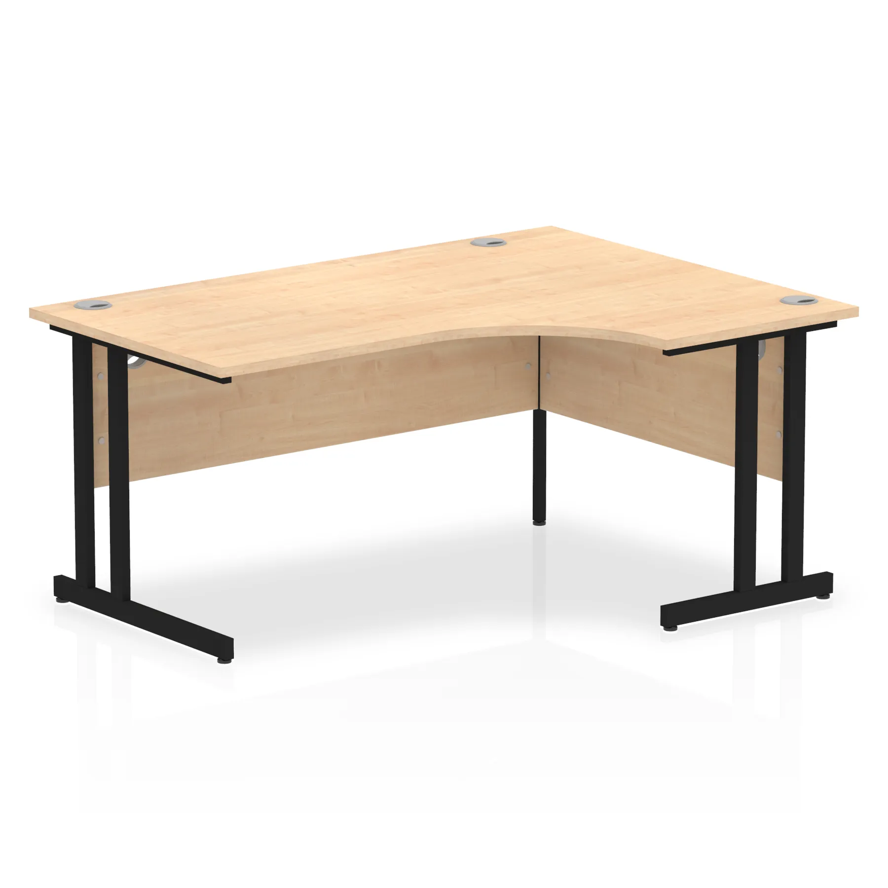 Impulse contract 1600 wide crescent desk | 25mm tops | Heat resistant beech melamine finish | 18mm modesty panels | 2mm protective abs edging | Silver coated double strut legs | 3 cable ports | Height adjustable feet | Steel to steel fixings | 3 modesty panels slots | 600 deep | Deep set modesty panel (5″) allows for compatibility of most screen clamp fittings | Weight Capacity 135Kg