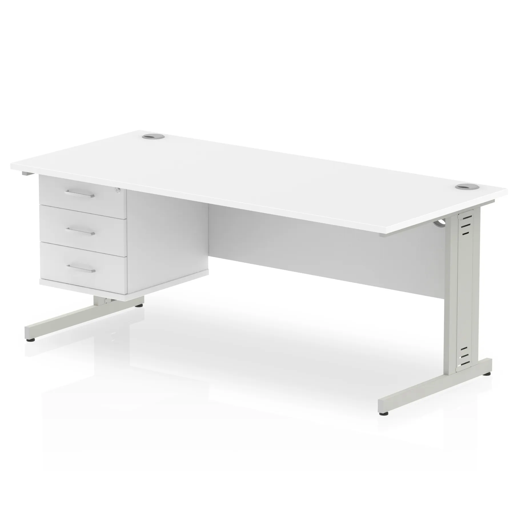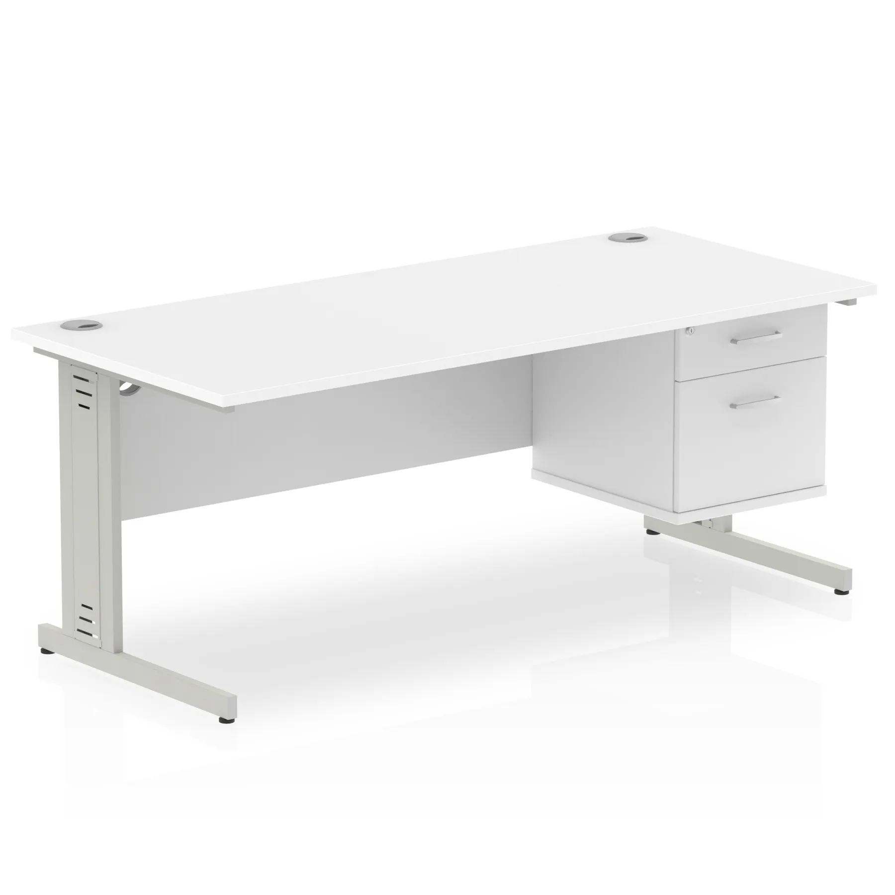 • Impulse contract 1800 wide desk • 25mm tops • Wire management panel • Heat resistant beech melamine finish • 18mm modesty panel • 2mm protective abs edging • Silver coated double strut legs • 2 cable ports • Height adjustable feet • Steel to steel fixings • 2 modesty panel slots • Deep set modesty panel (5”) allows for compatibility of most screen clamp fittings • Fixed pedestal