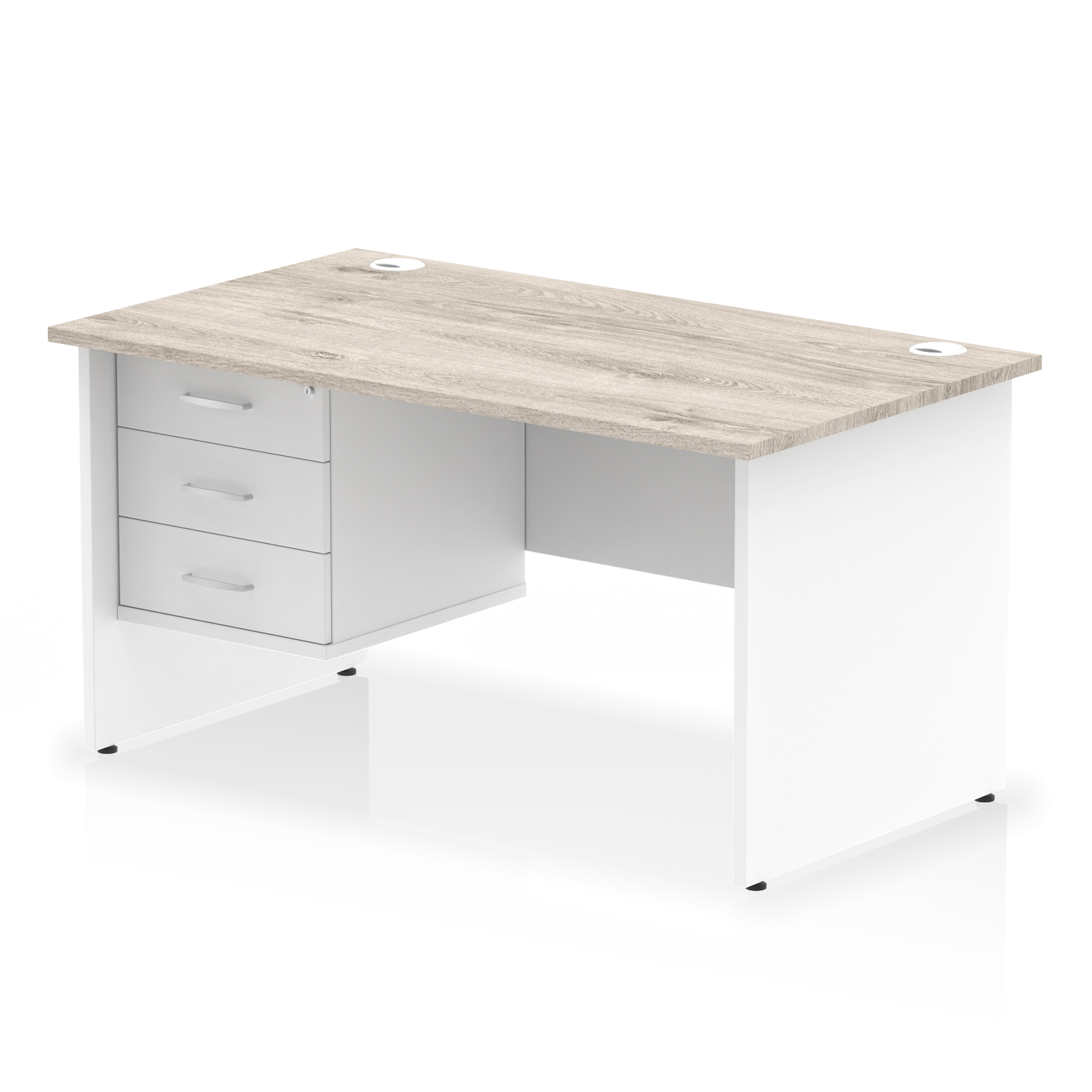 • Impulse contract 1400 wide desk • 25mm tops • Heat resistant beech melamine finish • 18mm modesty panel • 2mm protective abs edging • Matching wood panel end legs • 2 cable ports • Height adjustable feet • Steel to steel fixings • 2 modesty panel slots • Deep set modesty panel (5”) allows for compatibility of most screen clamp fittings • Fixed pedestal