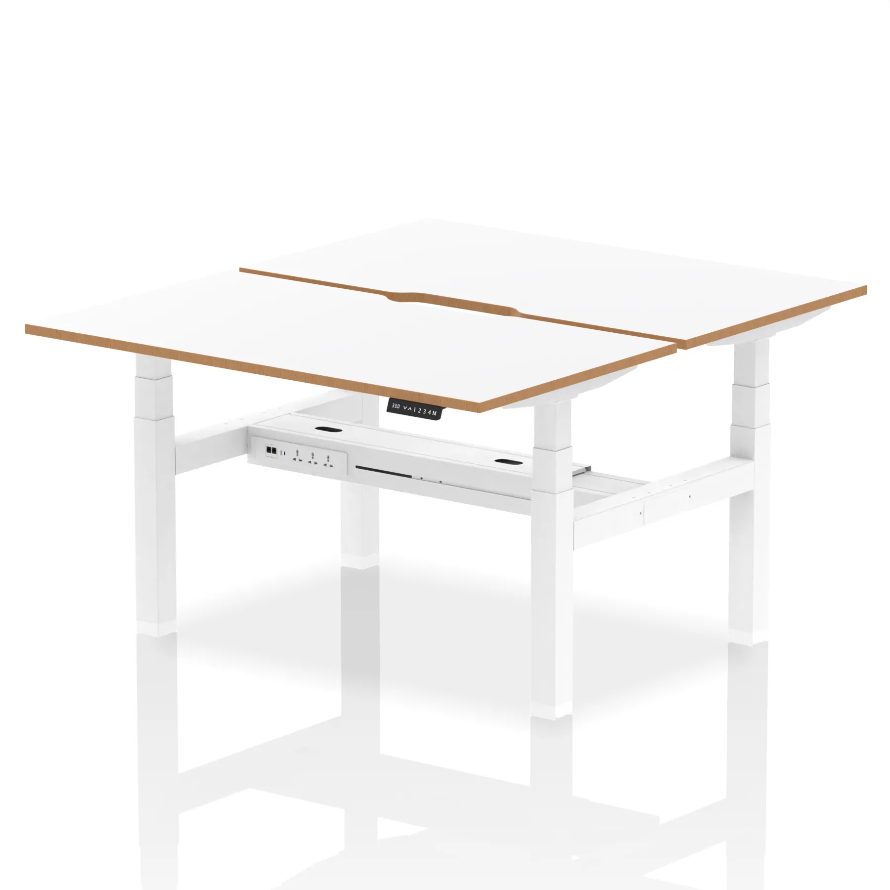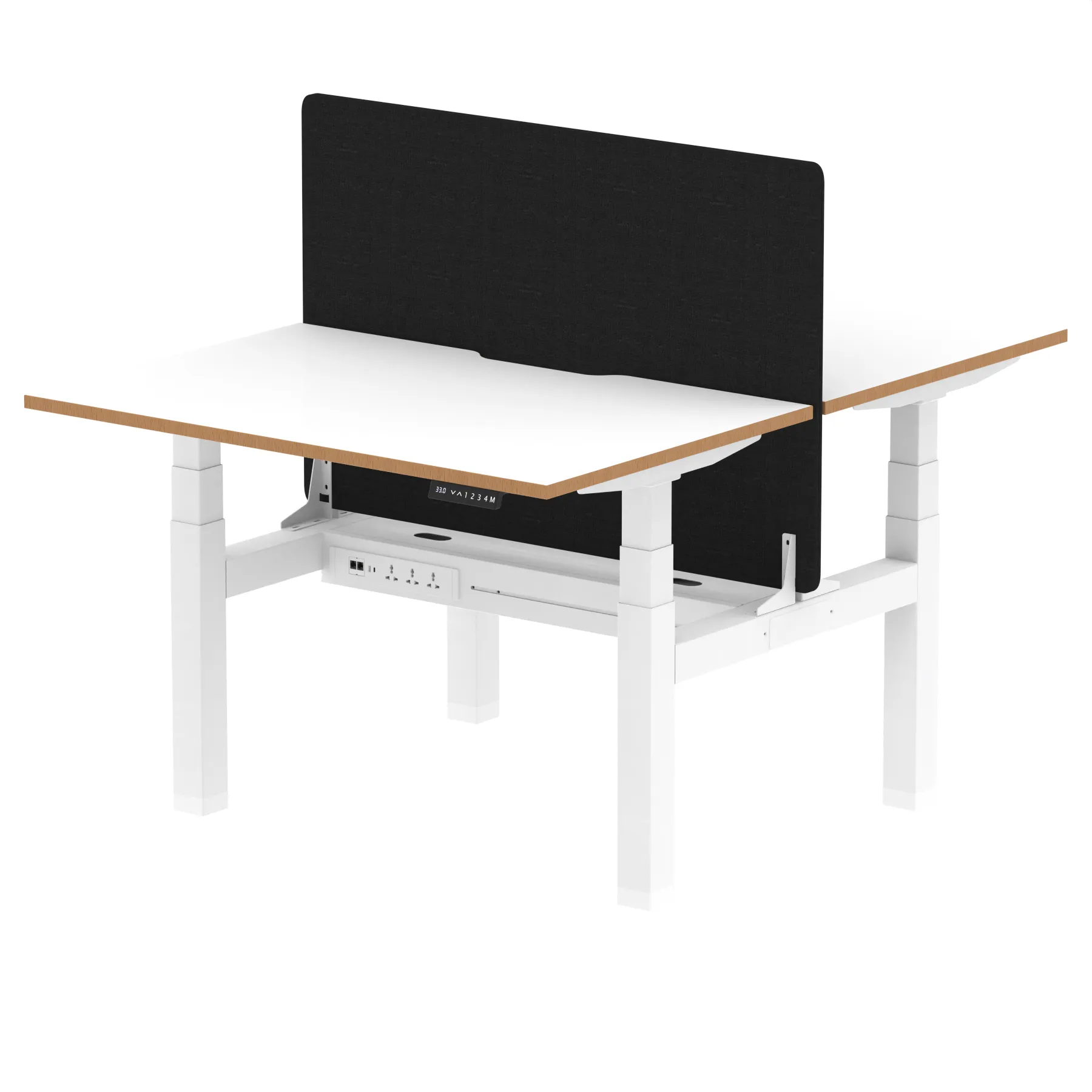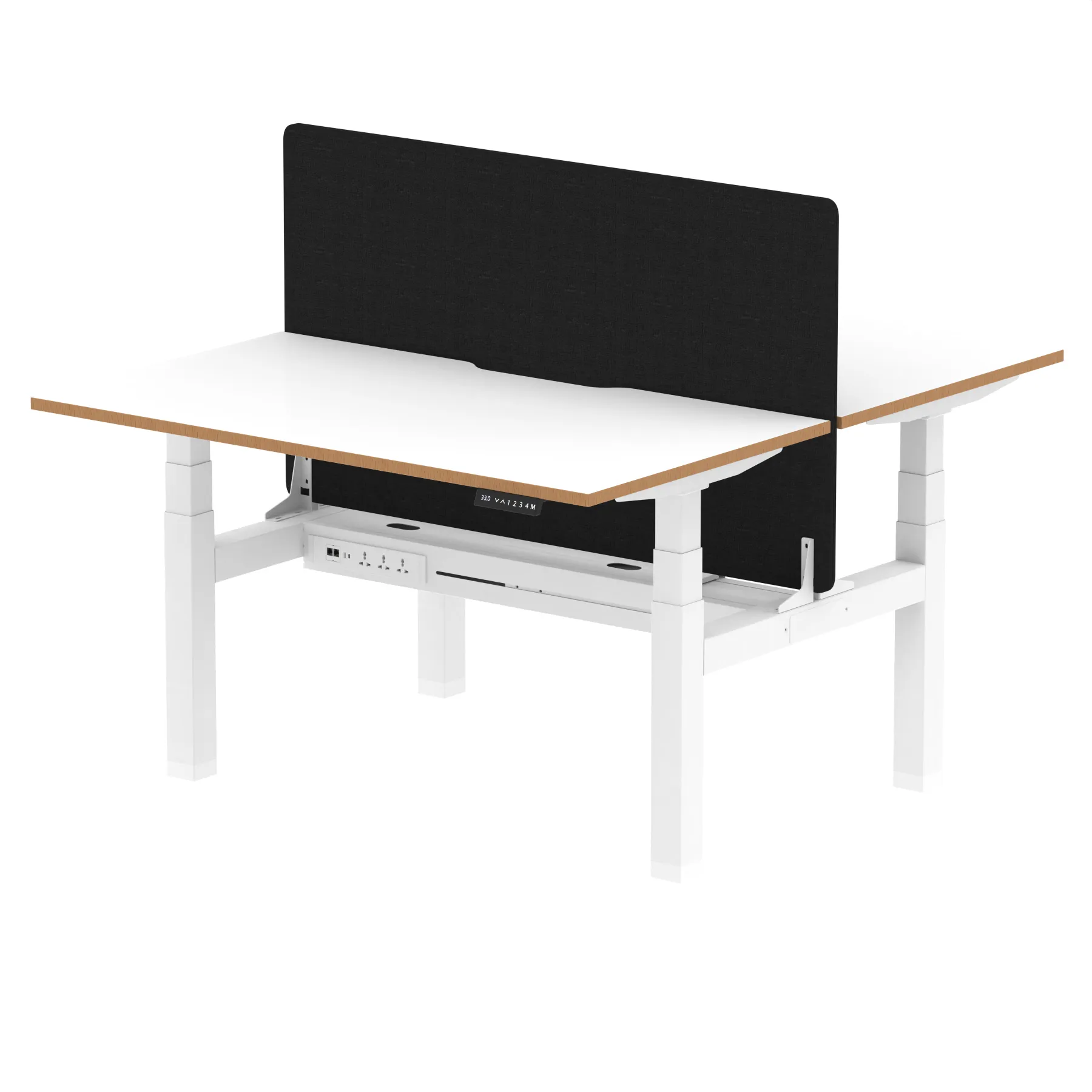 Elevate your office with the Air Back-to-Back Height Adjustable Desk, a blend of ergonomics and connectivity. Each desk includes two Ethernet ports, a USB and USB-C port, and three UK plugs, complemented by integrated cable ports for a clean setup. The addition of a straight screen offers privacy and focus. This desk is a perfect match for professionals seeking a tidy, tech-friendly, and adaptable workspace.