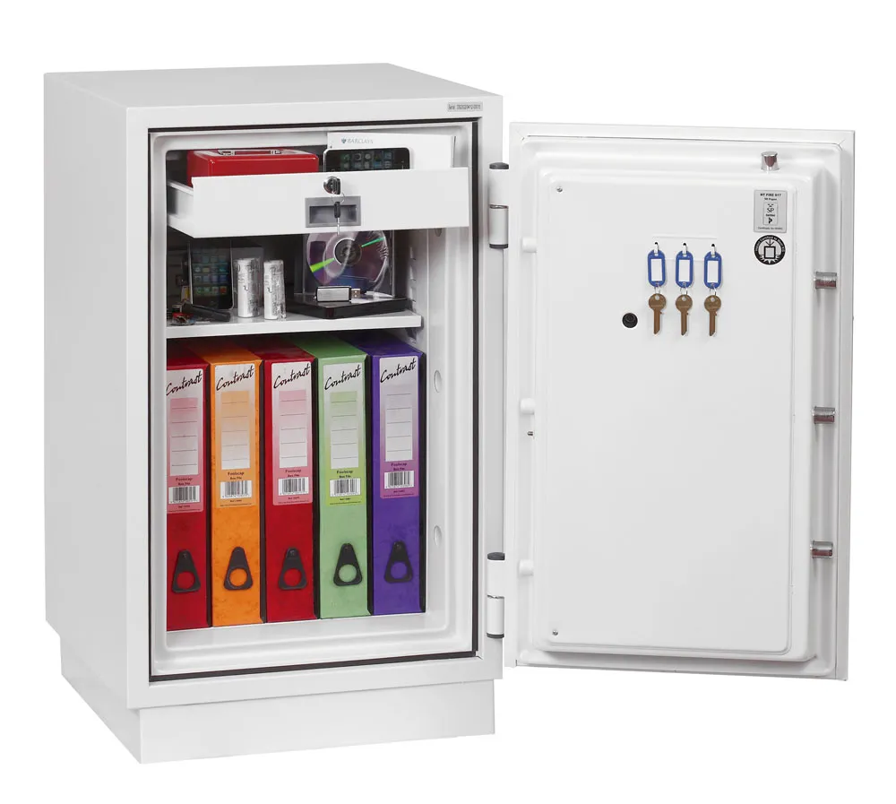 FIRE PROTECTION (PAPER) – Tested to Swedish NT Fire 017 – 90 Paper (Size 1 or 2) or 120 Paper (Size 3), providing up to 90 or 120 minutes fire protection respectively for paper documents | FIRE PROTECTION (DIGITAL MEDIA) – Tested to MTC – DIP120 – 60DM fire test standard, providing 60 minutes fire protection for digital media, DVD’s, USB memory stick and hard drives | SECURITY PROTECTION – The safe is recommended for an overnight cash risk of £2,500.00 or £25,000.00 valuables | DROP TEST – Fire and impact tested from 9.1 metres for resistance to the impact of falling through the burning floors of a building | FITTINGS – Each safe comes complete with height adjustable shelf and lockable cash/valuables drawer | FIXING – Ready prepared for floor fixing with fixing bolts for concrete supplied | SPECIAL FEATURES – Fitted with automatic slam shut door locking | COLOUR – Finished in a high quality scratch resistant paint RAL9003 White
