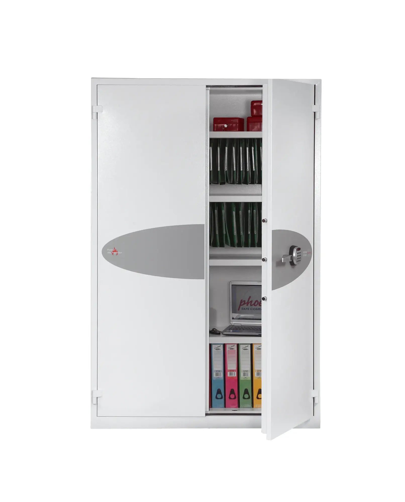 FIRE PROTECTION – Provides 30 minutes fire protection for paper records at 500 °C | SECURITY PROTECTION – The safe is recommended for overnight cash cover of £1,500 or valuables cover of £15,000 | CONSTRUCTION – High security 3 way espagnolette boltwork provides great strength and attack resistance | SPECIAL FEATURES – Supplied with 2 height adjustable shelves that also includes hanging rails for lateral files as standard | COLOUR – Finished in a high quality scratch resistant White paint RAL9003