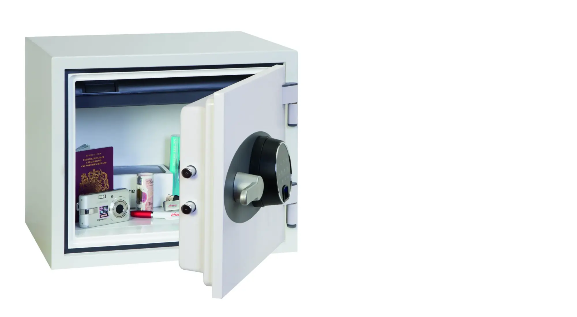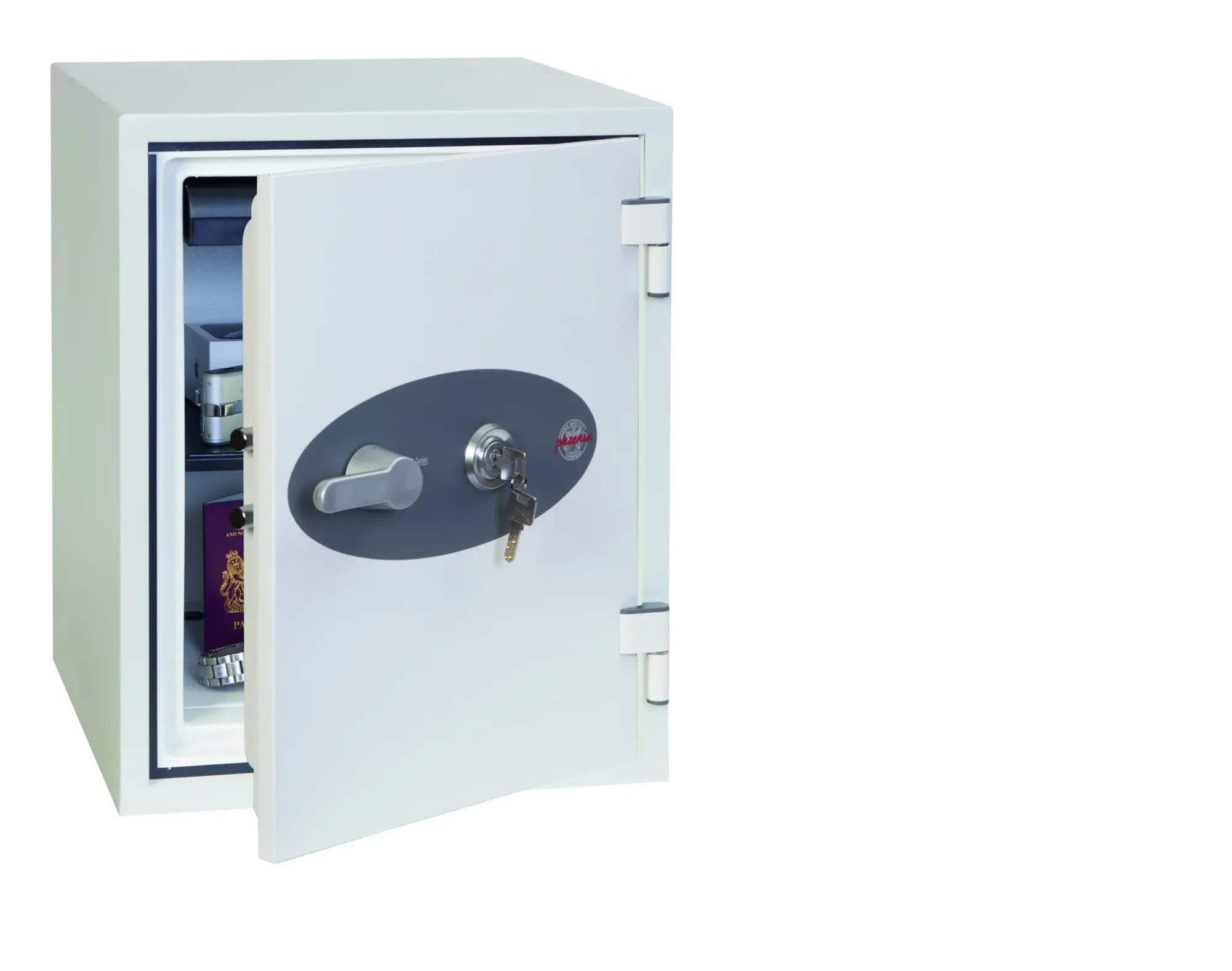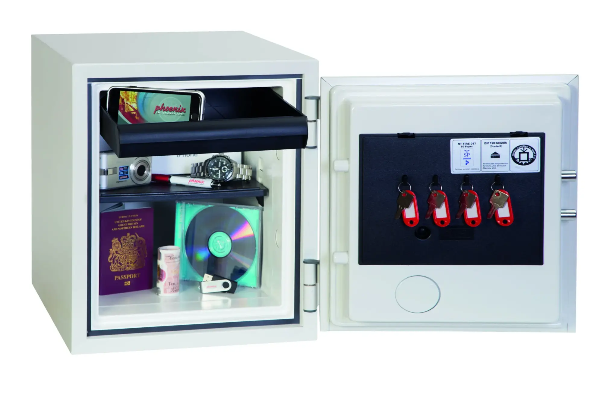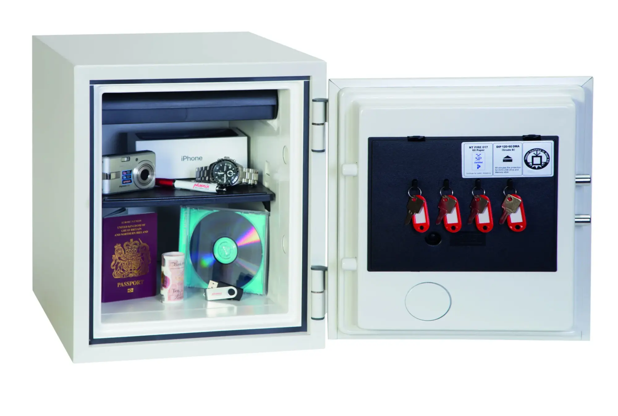 FIRE PROTECTION (PAPER) – Tested to the International NT Fire 017 – 60 fire test standard, at the Swedish SP Testing Centre providing 60 minutes fire protection for paper documents | FIRE PROTECTION (DIGITAL MEDIA) – Tested to MTC – DIP120 – 60DM fire test standard, providing 60 minutes fire protection for digital media, DVD’s, USB memory sticks & hard drives | SECURITY PROTECTION – The safe is recommended for an overnight cash risk of £2,000.00 or £20,000.00 valuables and is also ready prepared for floor fixing, with fixing bolts for concrete floors supplied | DROP TEST – Drop tested from 9.1 metres for resistance to the impact of falling through the burning floors of a building or the collapse of the building | SPECIAL FEATURES – Supplied with 4 internal key hooks, pull out drawer and (for Size 2 or 3) height adjustable shelf | COLOUR – Finished in a high quality scratch resistant paint RAL9003 White