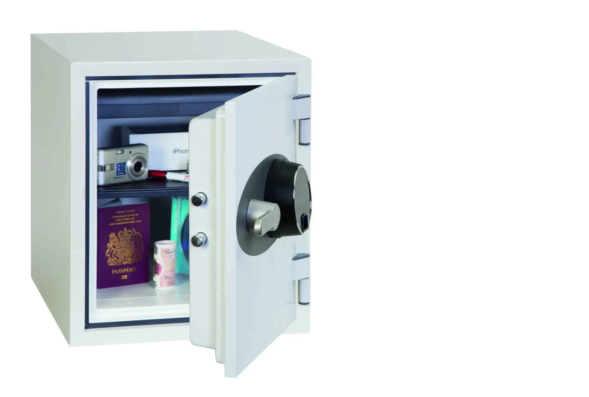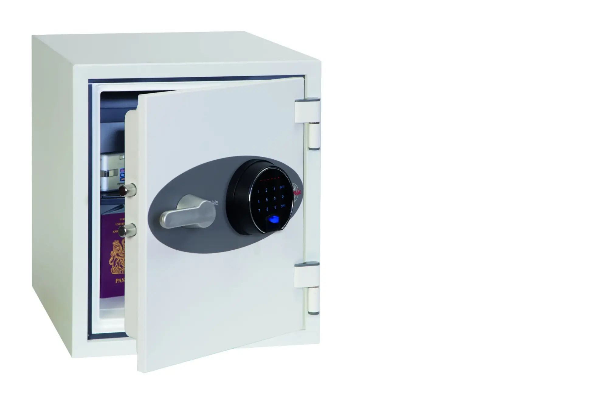 Fingerprint – Fitted with an advanced high security touchscreen keypad & fingerprint lock with clear LED display, internal alarm, dual control, hidden code and scrambled code that can be programmed as standard with up to 128 fingerprints